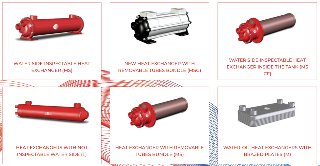 Stainless steel water-oil heat exchangers with brazed plates and tube-bundle heat exchangers from 60mm up to 350mm diameter: not inspectable, water-side inspectable and with removable tube-bundle. The construction materials change according to the type of application or according to the cooling fluid, being it soft water or seawater.